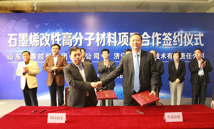 李合军在致辞时表示,石墨烯被称为未来新材料领域的"工业味精",石墨烯材料应用广泛、性能优异。鲁泰控股集团下属金威化工所生产的PVC是生产塑料的基础原料,在工程塑料、功能塑料开发及生产上与石墨烯有着众多的契合点,发展前景非常广阔。利特纳米公司拥有成熟的石墨烯制取技术和石墨烯新材料开发经验。鲁泰控股集团与利特纳米公司的这次合作,搭建了以石墨烯和聚氯乙烯为原料的新材料开发平台,实现了优势资源和先进技术的有机融合,不仅能够扩大石墨烯产业化应用,而且能够大幅度提升PVC产品附加值,有利于合作双方实现共赢、共同发展。协议签订后,我们将按照约定,与利特纳米公司共同加快推进石墨烯改性材料的开发,最终实现产业化应用,打造新的经济增长点,推动企业实现提质增效、转型升级,为济宁市地方经济发展做出新的贡献!